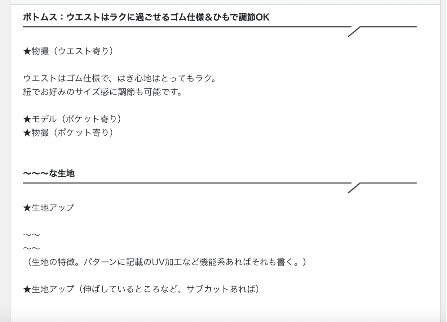 彼女は、私と一緒にウェアの企画を担当してくれていて、ページの統括もしてくれています。で、新しく入ったそのスタッフに伝えていくために、 【販売ページのフォーマット】を、作ってくれたんです。