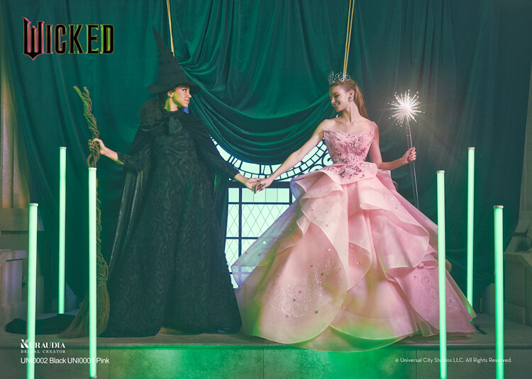 クラウディアより、映画ウィキッドの劇中に登場する衣裳の印象を細部まで丁寧に表現した全6型のドレス&タキシードが誕生しました。