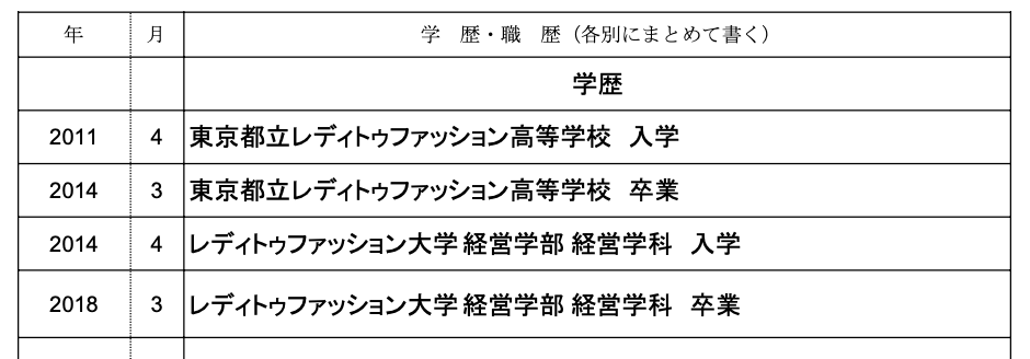 一行目の真ん中に「学歴」と記載し、二行目から入学・卒業(修了)の経歴を年月が古い順に記載していきます。新卒の場合は中学卒業から、それ以外では原則として高等学校や専門学校(入学)から記入します。