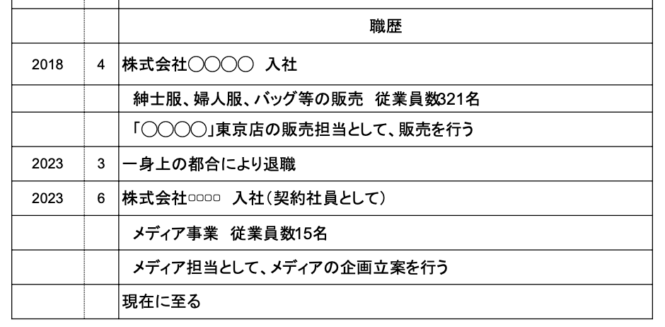店舗で働いた経験がある場合、勤務した企業名や店名を正式名称で記載します。(例:「株式会社〇〇入社〇〇店 接客・販売/従業員数約80名」)会社名の横もしくは次行に、会社の規模感と簡単な職務内容を書くと、担当者も分かりやすいです。