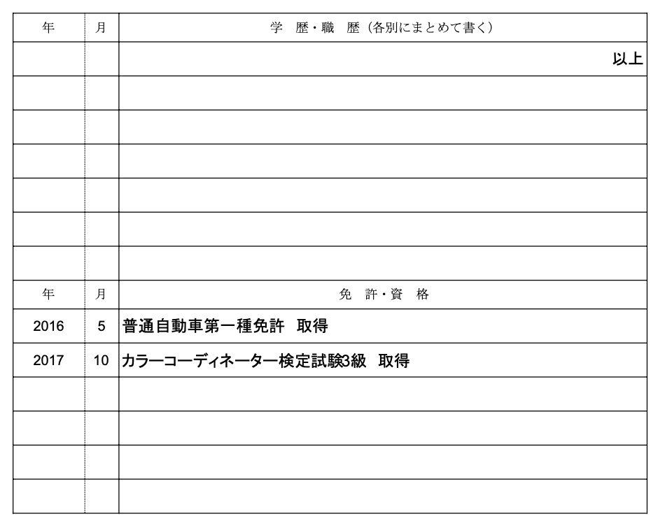 職歴の最終行(改行した行)には、「以上」と右寄せで記載します。