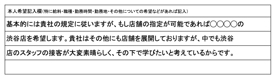特定の店舗や地域がある場合は、「〇〇店での勤務を希望します」と明確に書くことで、採用担当者に、具体的なビジョンがあると伝わります。特に希望がなければ「貴社の規定に従います」と記入しましょう。