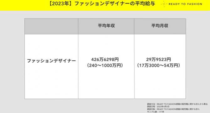 気になるファッションデザイナーの求人事情。 この記事では、弊社が運営するファッション・アパレル業界特化型の求人サイト「READY TO FASHION」に掲載された171件超の求人情報(2023年4月5日時点)から得られ … 続きを読む 【2023年】ファッションデザイナーのリアルな給料事情。平均年収・月収を独自データから発表