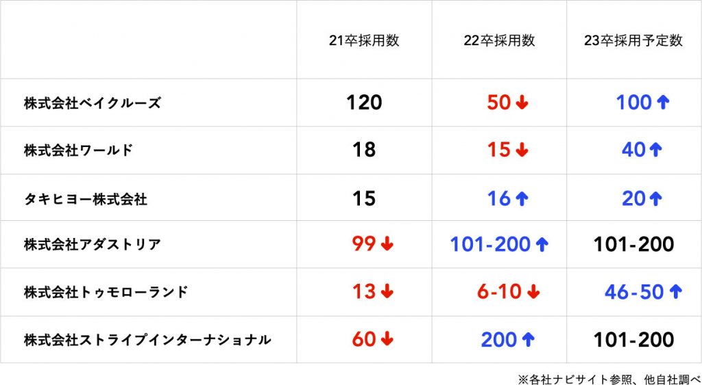 2022年度で新卒採用人数を縮小していた株式会社ベイクルーズの場合、2022年度新卒採用人数50人に対し新卒採用予定人数は100人へと上昇。2021年度の新卒採用人数に迫っています。