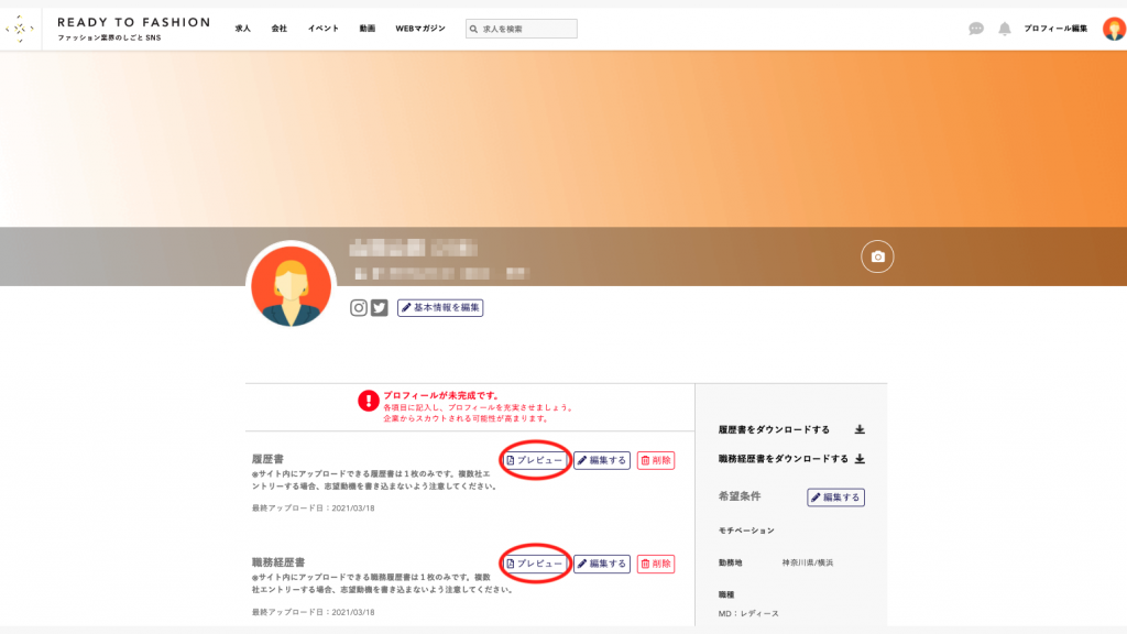 プロフィール編集画面の「プレビュー」をクリックすると、アップロードした履歴書・職務経歴書を確認できます。