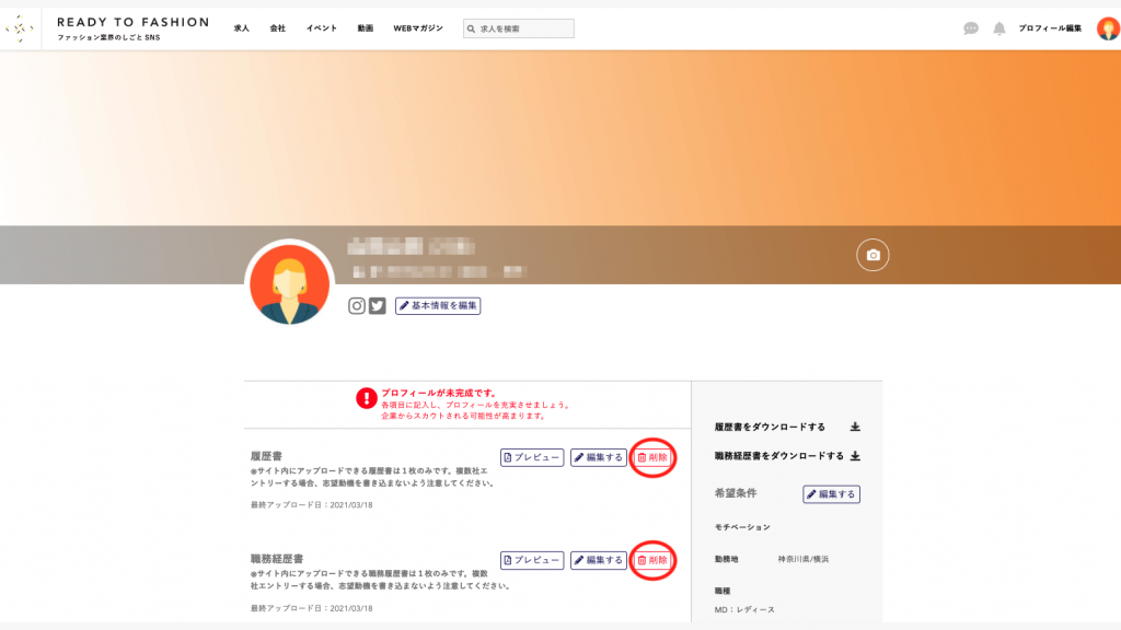 プロフィール編集画面の「削除」をクリックすると、アップロードした履歴書・職務経歴書を削除できます。