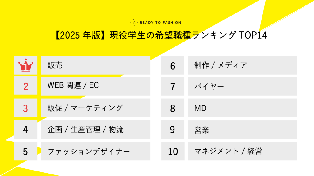 ファッション・アパレル業界に特化した求人サイトを運営する「READY TO FASHION」は、READY TO FASHIONに登録している学生(2001年〜2006年生まれ)ユーザーのプロフィールを分析し、希望職種をランキング形式で発表します。