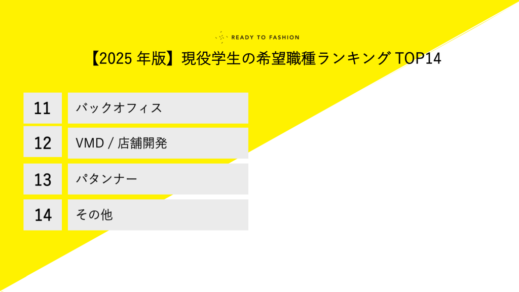 4位以降には、デザイナーや企画・生産管理などの専門職がランクイン。10位前後にはMD、営業、バックオフィスなどの本社職が並び、現場職から管理・運営に関わる職種まで、志向の幅の広さがうかがえます。