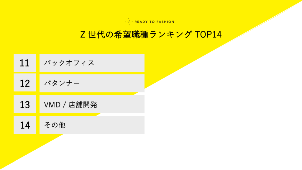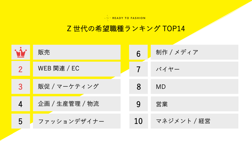 ファッション・アパレル業界に特化した求人サイトを運営する「READY TO FASHION」は、「READY TO FASHION」に登録しているZ世代(1996年〜2012年生まれ)ユーザーのプロフィールを分析し、希望職種をランキング形式で発表します。