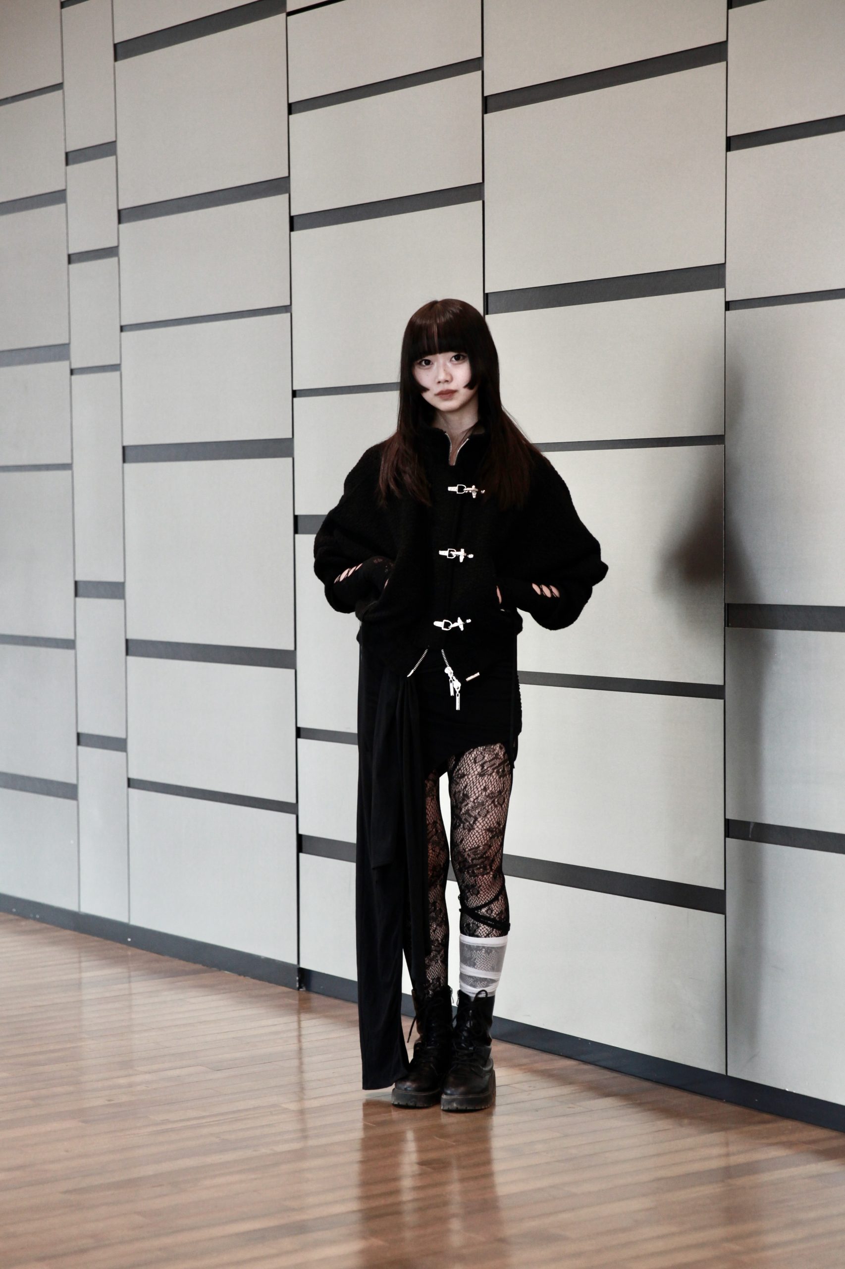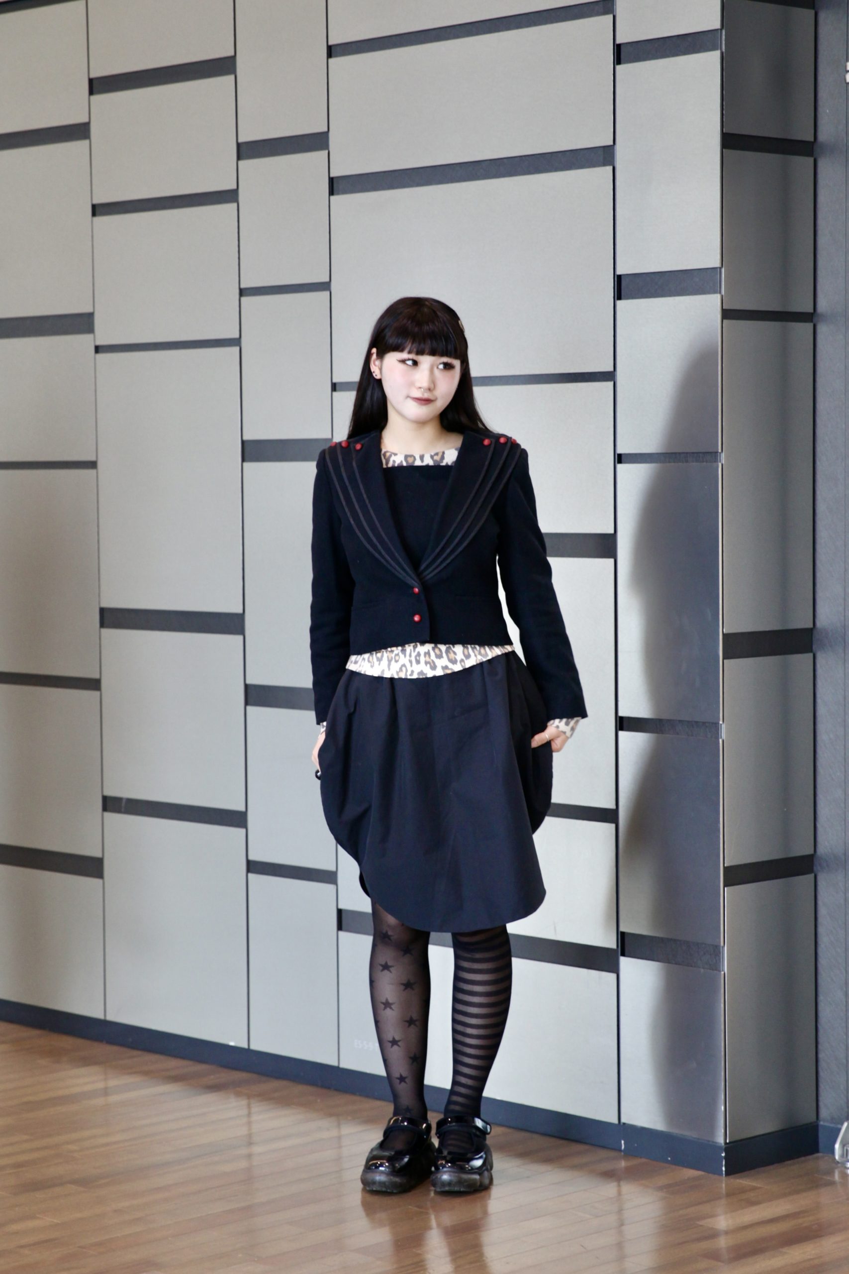「黒でスタイリングをまとめました。アシンメトリーのストッキングがポイント」