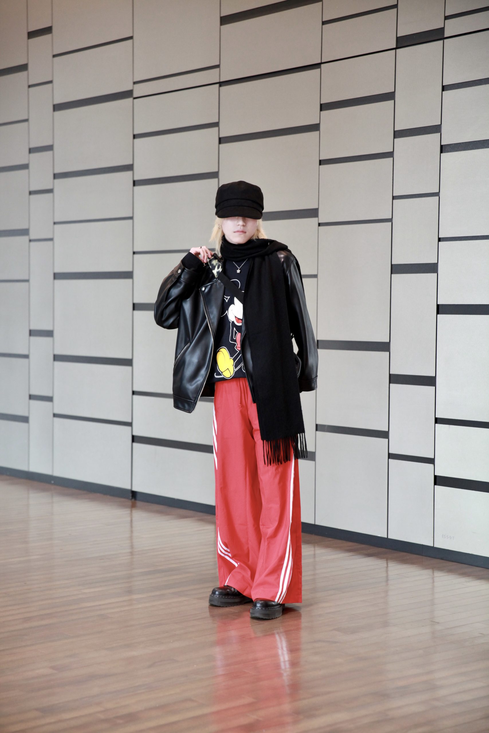 「黒でまとめつつも、Tシャツのキャラクター柄を拾うようにボトムを組みました」