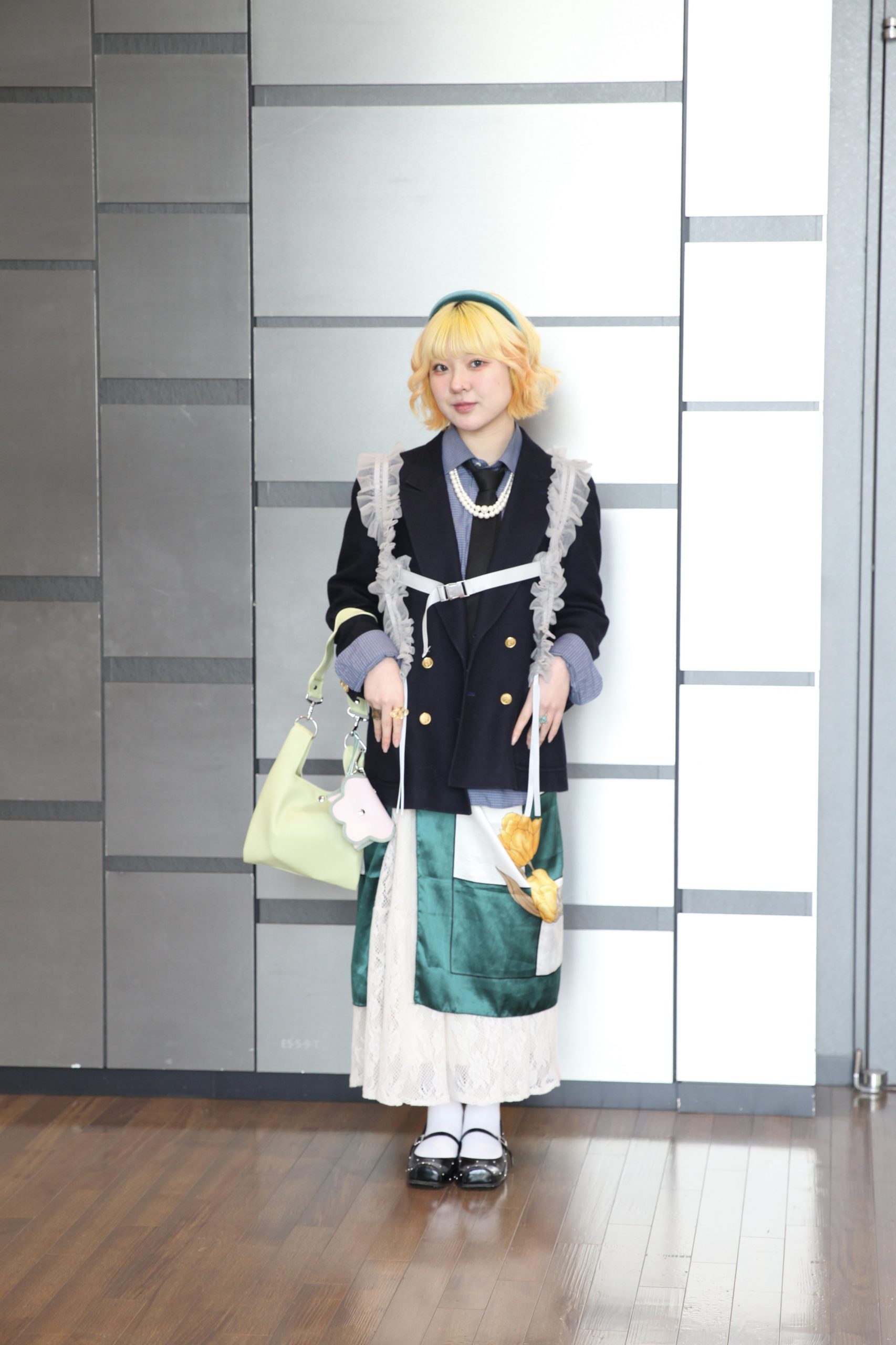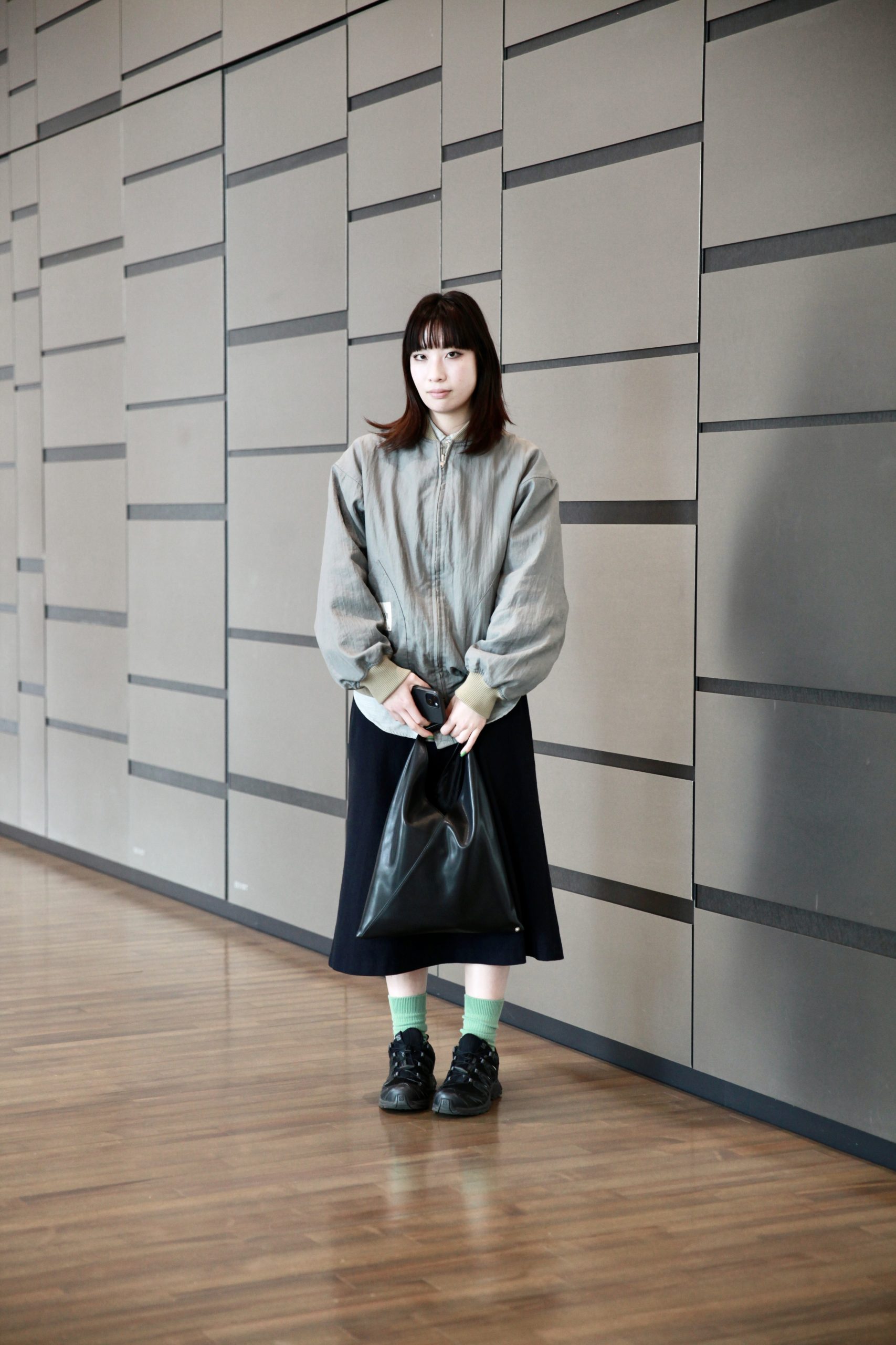 「ネイルと靴下のグリーンカラーを合わせたのがポイント。ブルゾンとスカートでバランスを取りました」