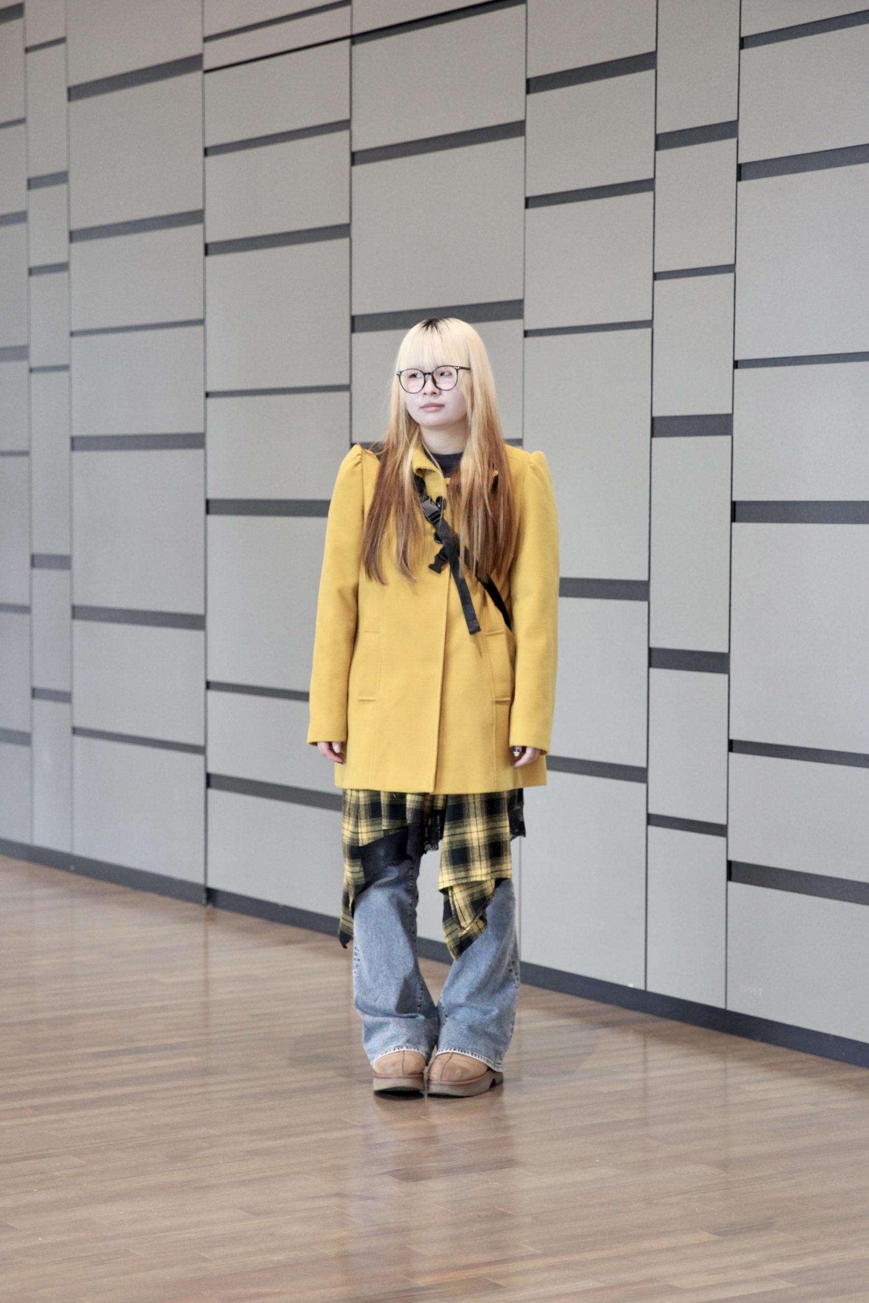 「髪色に合わせてイエローを意識したコーデにしました。説明会を意識した伊達メガネがポイント」