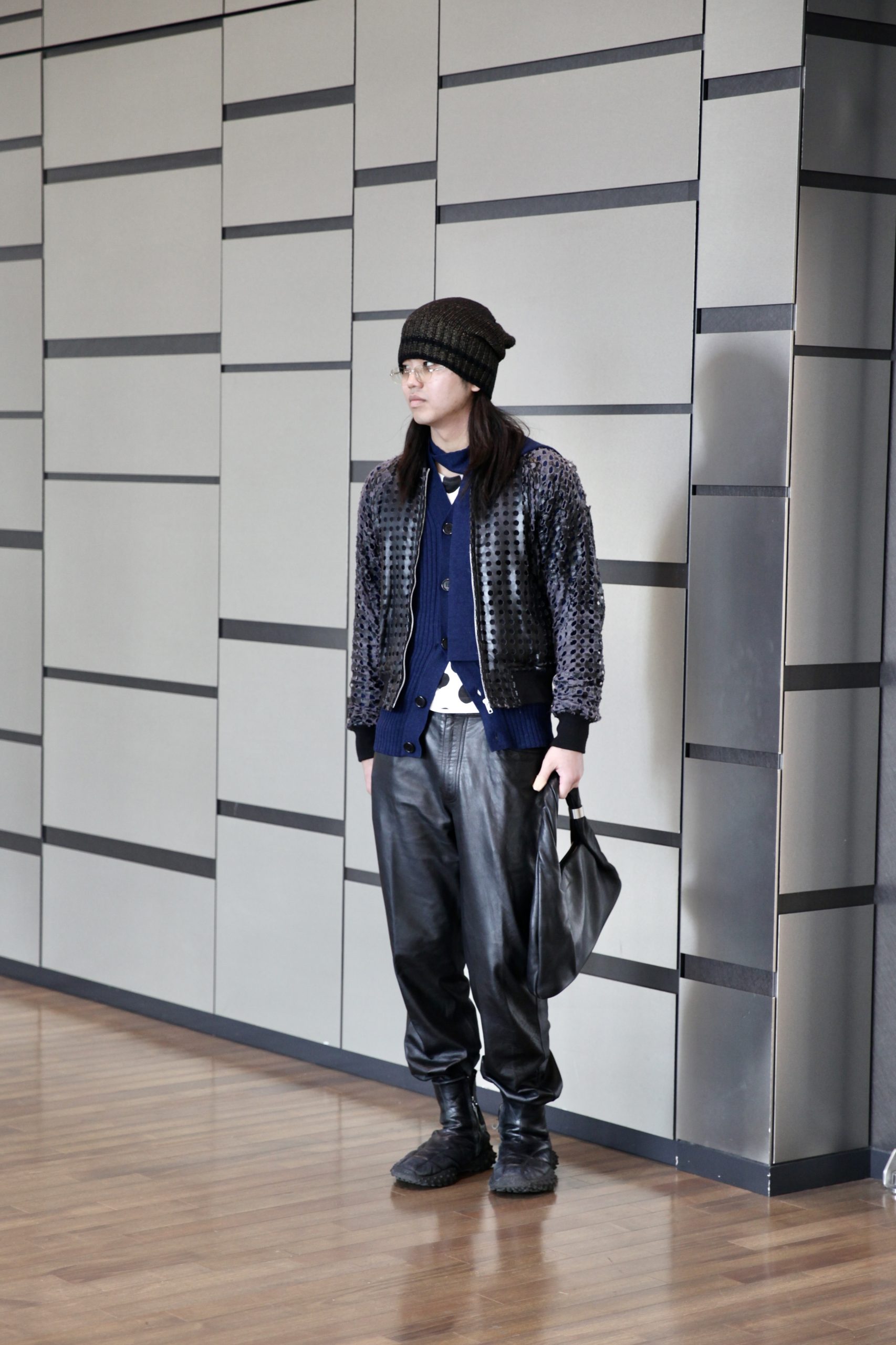 「レザーを多く使い、大人っぽいスタイリングにしつつ、ニットとTシャツでカジュアルに外しました」