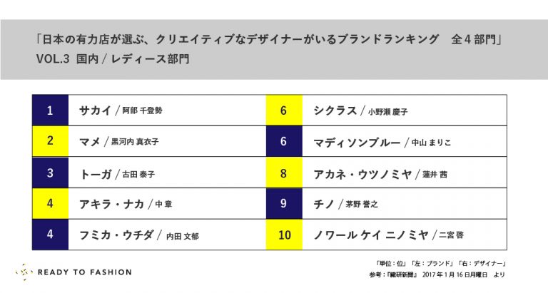繊研新聞が発表した、今注目すべき「最もクリエイティブなデザイナーランキング」(1月16日付)。これは、日本の有力セレクトショップのバイヤーや百貨店のディレクターが選ぶもので、まさに今のファッション業界を牽引してくれている … 続きを読む 今注目すべき、最もクリエイティブなデザイナーがいるブランドはどこ? Vol.3:国内/レディース部門|アパレル業界について知る!