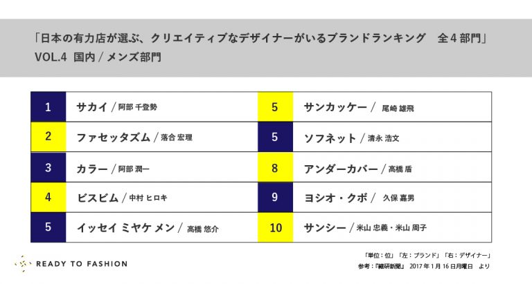 繊研新聞が発表した、今注目すべき「最もクリエイティブなデザイナーランキング」(1月16日付)。これは、日本の有力セレクトショップのバイヤーや百貨店のディレクターが選ぶもので、まさに今のファッション業界を牽引してくれている … 続きを読む 今注目すべき、最もクリエイティブなデザイナーがいるブランドはどこ? Vol.4:国内/メンズ部門|アパレル業界について知る!