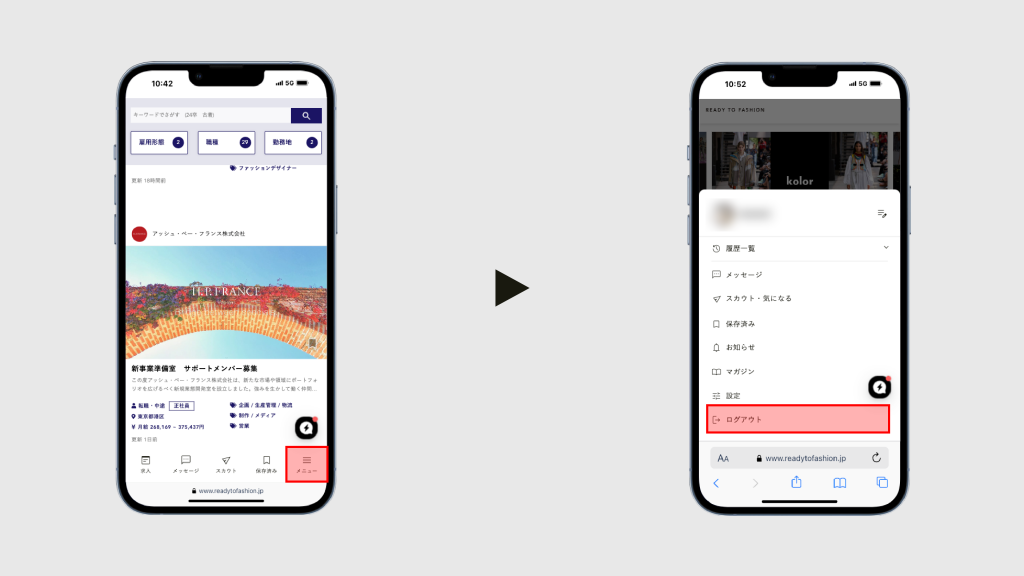 ログアウトしたい メニュー>ログアウト からログアウトできます アカウントからログアウトする場合はメニュー内「ログアウト」よりログアウトできます。 ログインに使用してたSNSアカウントを削除してしまった パソコンは持ってないですが登録できますか? スカウト設定を確認・変更したい ログインできない時の解決方法を知りたい ログアウトしたい 登録したメールアドレスを変更したい 登録は無料ですか? ログインしたい アカウントを退会したい パスワードを再設定したい アカウントを登録したい