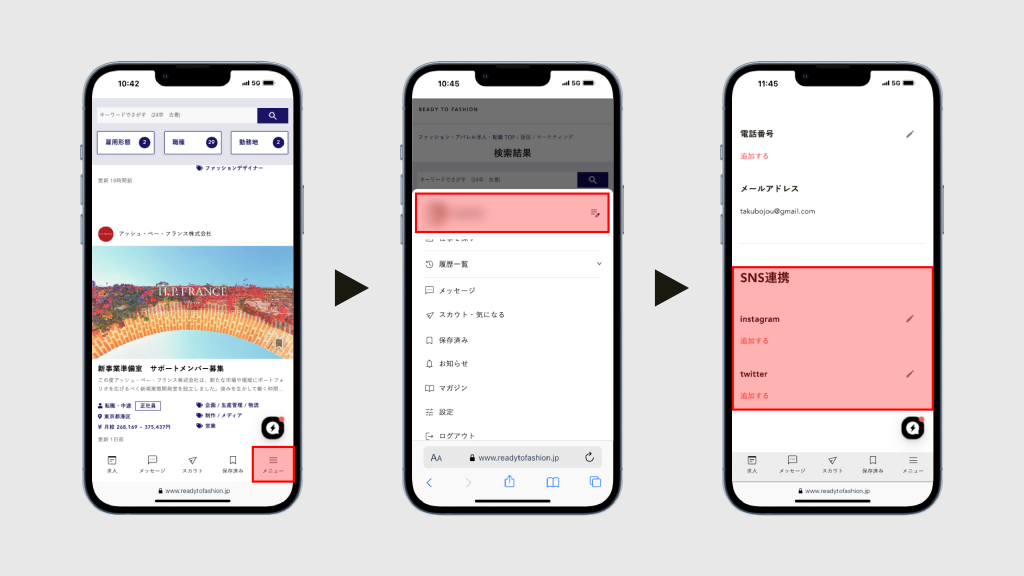 SNSと連携したい メニュー>画面上部>SNS連携 から連携できます プロフィールページからSNSを連携することができます。 連携できるSNSはInstagram、Twitterです。 履歴書・職務経歴書を作成したい 複数の会社にエントリーする際、志望動機は記入しない方がいいですか? 紹介文を変更したい 希望条件について知りたい 好きなブランドについて知りたい 苗字を変更したいのですが。 履歴書・職務経歴書をPDFにしたい SNSと連携したい プロフィールは誰でも閲覧可能ですか? 履歴書・職務経歴書をアップロードしたい プロフィール写真を変更したい プロフィールを編集したい