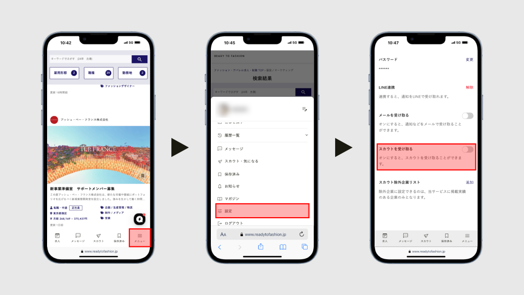 スカウト設定を確認・変更したい メニュー>設定 から変更できます スカウトの受信設定を確認・変更する場合はメニュー内「設定」から編集できます。 また、スカウトから除外したい企業も設定できます。現職に転職活動をしていることを知られたくない場合にお使いいただけます。 ログインに使用してたSNSアカウントを削除してしまった パソコンは持ってないですが登録できますか? スカウト設定を確認・変更したい ログインできない時の解決方法を知りたい ログアウトしたい 登録したメールアドレスを変更したい 登録は無料ですか? ログインしたい アカウントを退会したい パスワードを再設定したい アカウントを登録したい