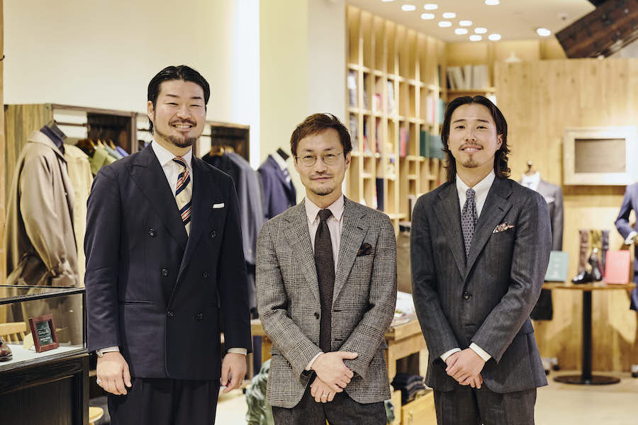 真ん中:中島啓介(なかじま・けいすけ)1972年 大阪府出身。麻布テーラーSQUARE 二子玉川店 マスターテーラー。2006年に麻布テーラー表参道店に配属。2019年9月から現職。組合員長を務める。