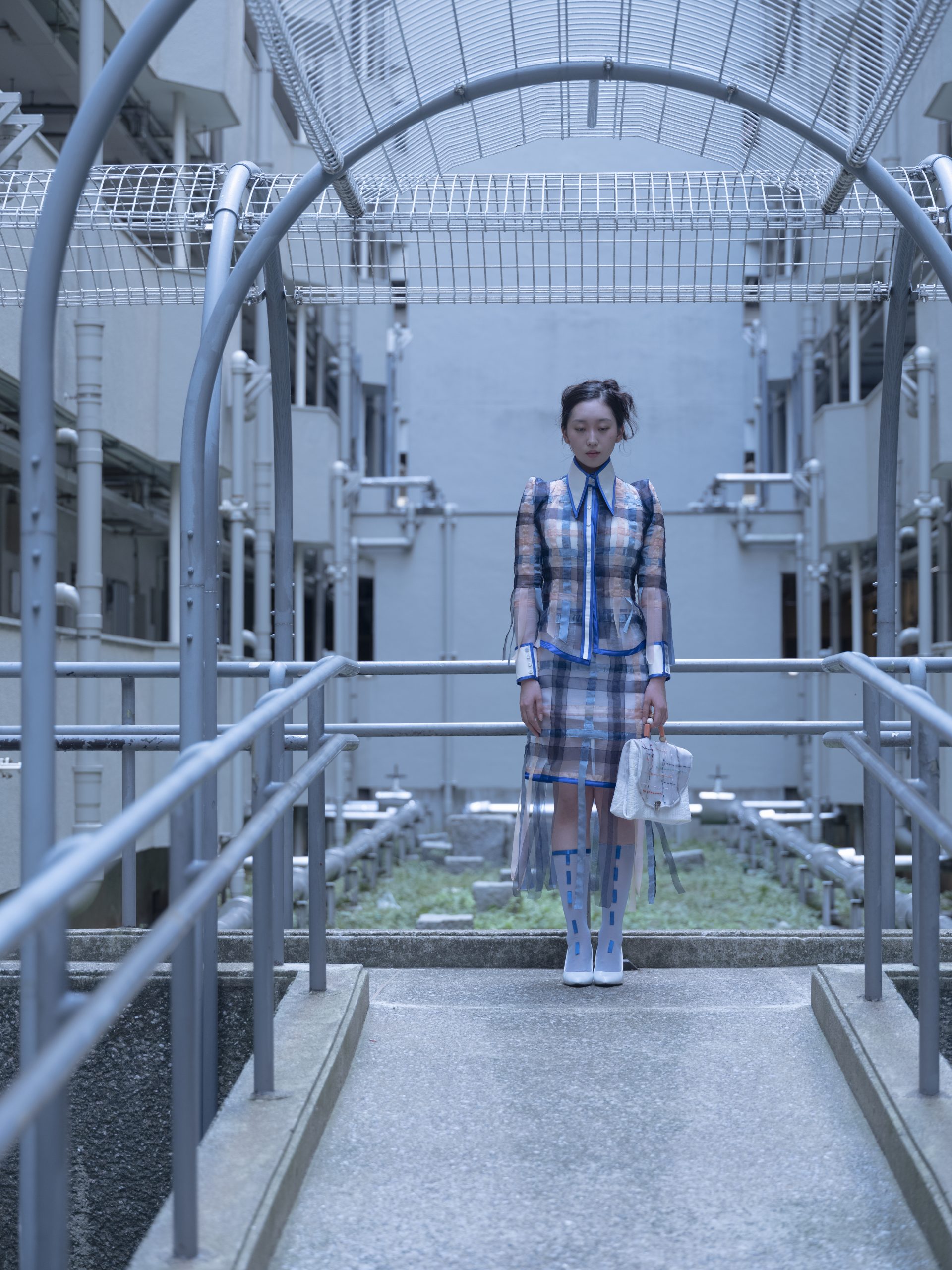 長野:私が制作したルックはスーツの形式を模しつつ、全体を透ける素材で包み、均等なチェック柄を散りばめています。誰かの視線を常に意識しながら生きる昨今の社会では、あらゆる場面において合理性や完璧さが求められがちですが、不器用でも自分であることを守りたい。その朗らかな抵抗を表現しました。