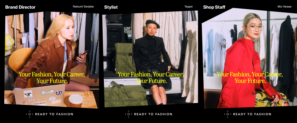 広告ビジュアルにスタイリストのTEPPEI氏、ファッションディレクターの三條場夏海氏、ショップスタッフの柳瀬美央氏を起用しました。彼らは、地道な努力と現場での経験を積み重ねながら、自らの力でキャリアを切り開いてきたファッション業界の第一線で活躍するプロフェッショナルです。その姿勢や働き方は、まさにREADY TO FASHIONのユーザーにとって身近で共感できるものであり、多くの人にとって憧れとなる存在でもあります。発信力を持ちながらも、地に足のついたリアルな視点を持ち、等身大で今をしなやかに生きる3人の姿が、ファッション業界を目指すすべての人の背中を押すことを願っています。