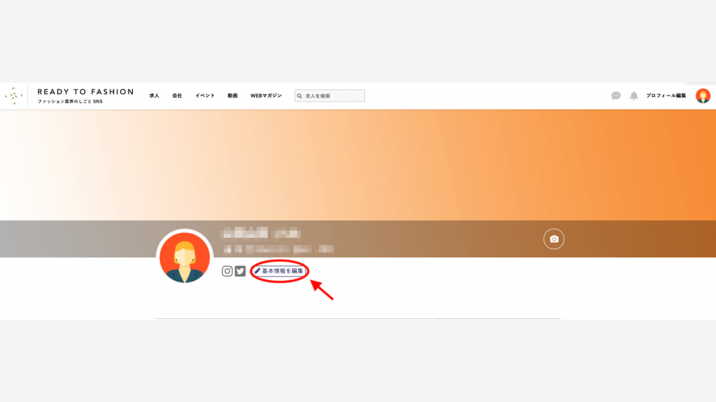 ①「READY TO FASHION」サイト右上部の「プロフィール編集」をクリック。