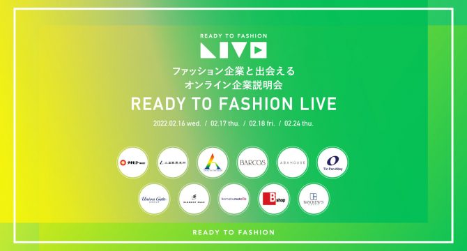 株式会社READY TO FASHIONは2月16日(水)~18日(金)、 2月24日(木)の日程で、オンライン合同説明会イベント「READY TO FASHION LIVE」を開催します。 「READY TO FASH … 続きを読む 23新卒向けオンライン企業説明会「READY TO FASHION LIVE」開催
