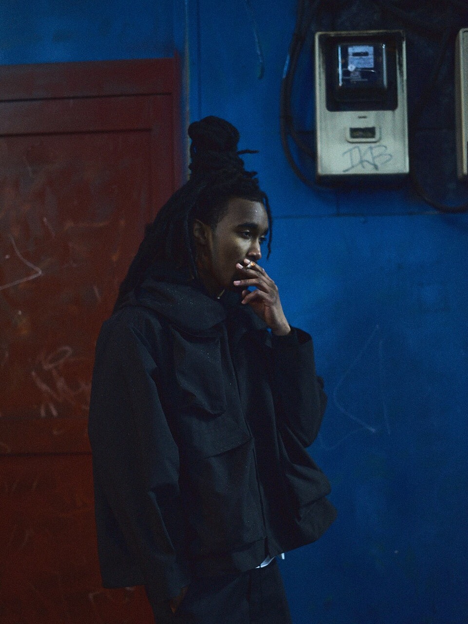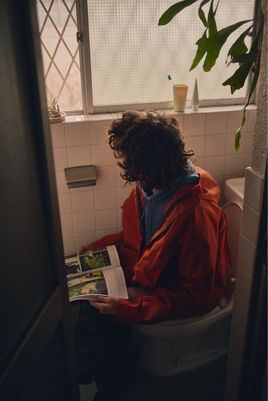 菊田:今回のルックでは、プロを一人も使っていません。カメラマンやヘアメイクはアシスタントの方で、モデルは学校の友達。専門としてる人たちではないので、ガチガチのルックにはなっていないです。そこで勝負するわけではないから、一日の流れを追うようなリアルさを出したかったんですよ。スタジオでタバコを吸わせたり、corekiyoの服を着てないところを撮ったり、地面に新作の服を並べて上に寝ていたり。通常のブランドのルックではやらないけど生活の中では割とあり得る瞬間を連想して撮りました。