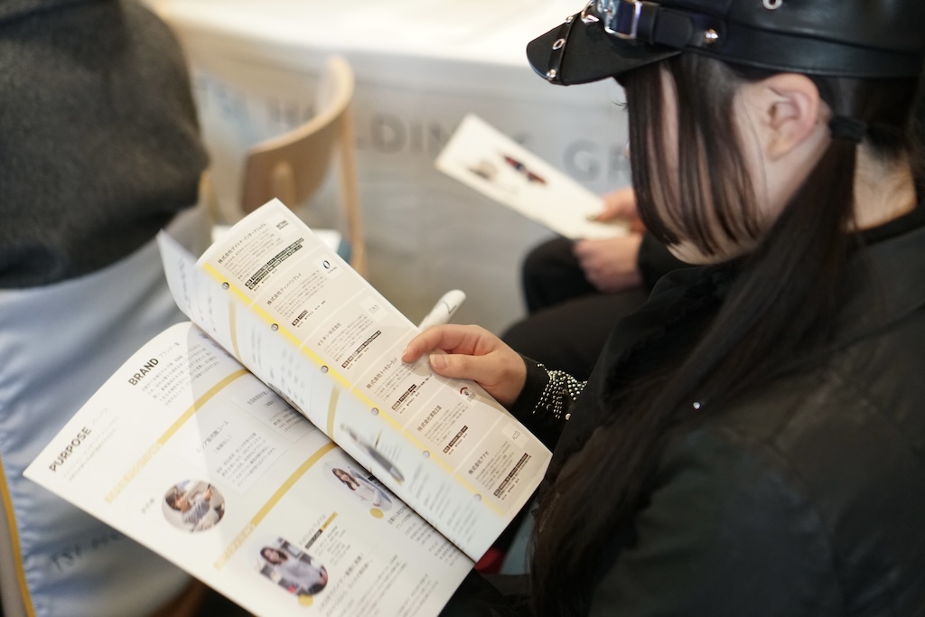 各ブースでは、企業担当者がブランドの特徴や仕事内容、キャリアの広がりについて説明。学生はメモを取りながら話を聞いたり、気になった点を個別で質問したりと、真剣な表情で企業と向き合う姿が印象的でした。
